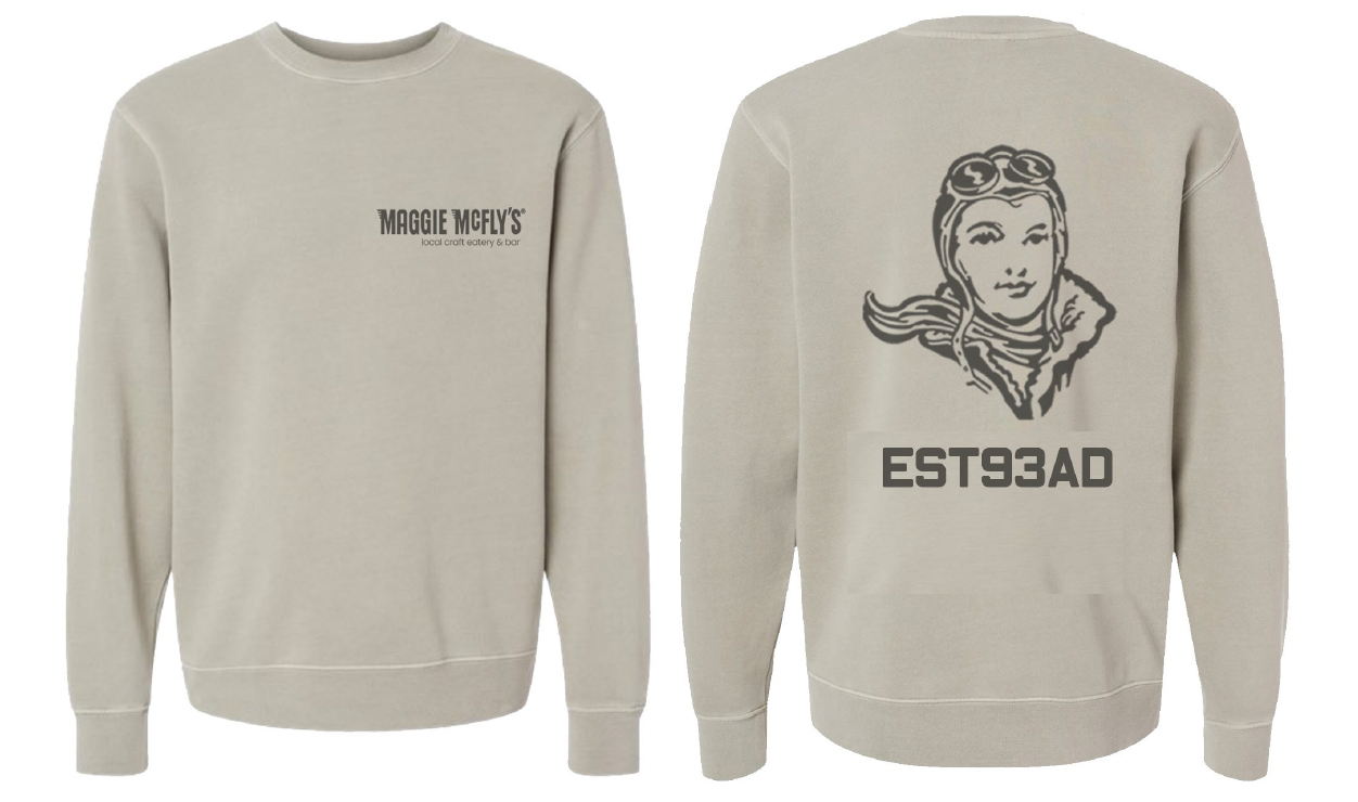 Medium weight crew adorned with signature Maggie McFly's front logo and our iconic Aviator Maggie with date stamp 93 in tone-on-tone cement hue. A staple design for all brand fans.