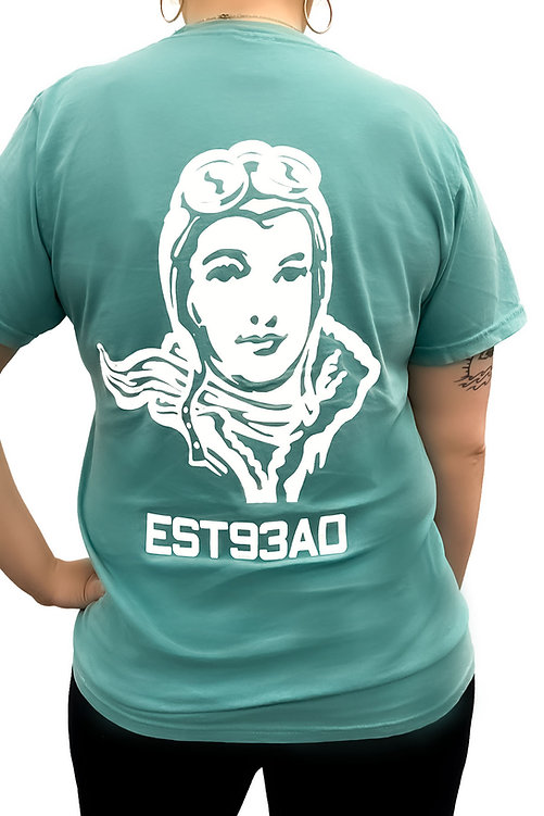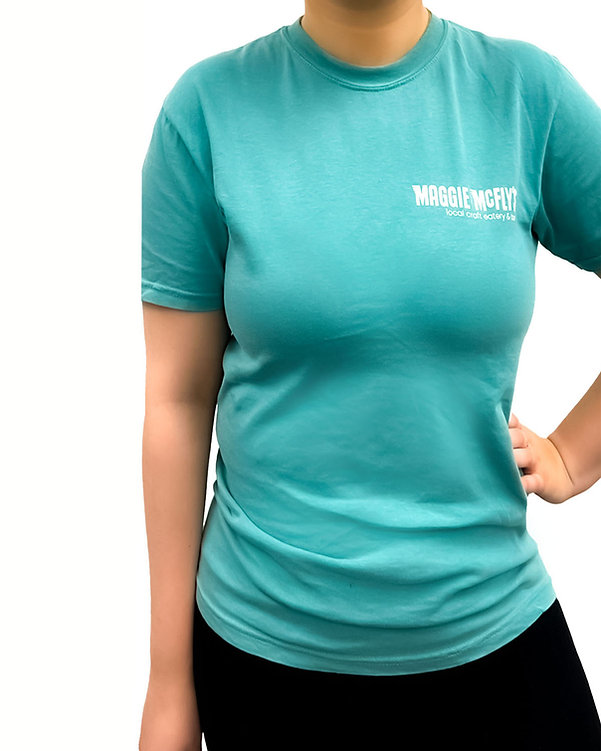 NEW Lagoon Blue colorway, medium-weight tee adorned with Maggie McFly's® front logo and our iconic "Maggie" silhouette in white print on the back.