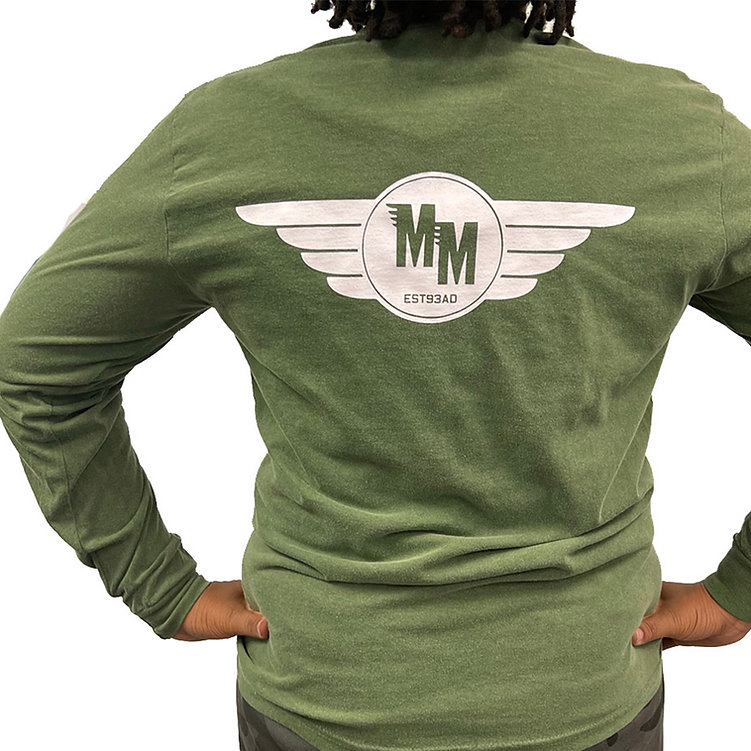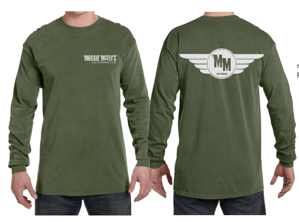 Medium weight long sleeve tee adorned with Maggie McFly's® front logo and our reimagined aviation wings with date stamp 93 in light grey print.